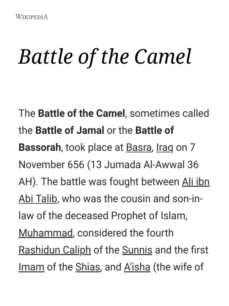 She was sent with an escort to medina with all honors. Quiz 1929 (#battleofcamel) q1when was it fought? The battle of the jamal (camel) is one of the greatest tragedies in the history of islam. Ali did not want to fight and agreed to negotiate. The battle of the camel, sometimes called the battle of jamal or the battle of bassorah, took place at basra, iraq on 7 november 656.
