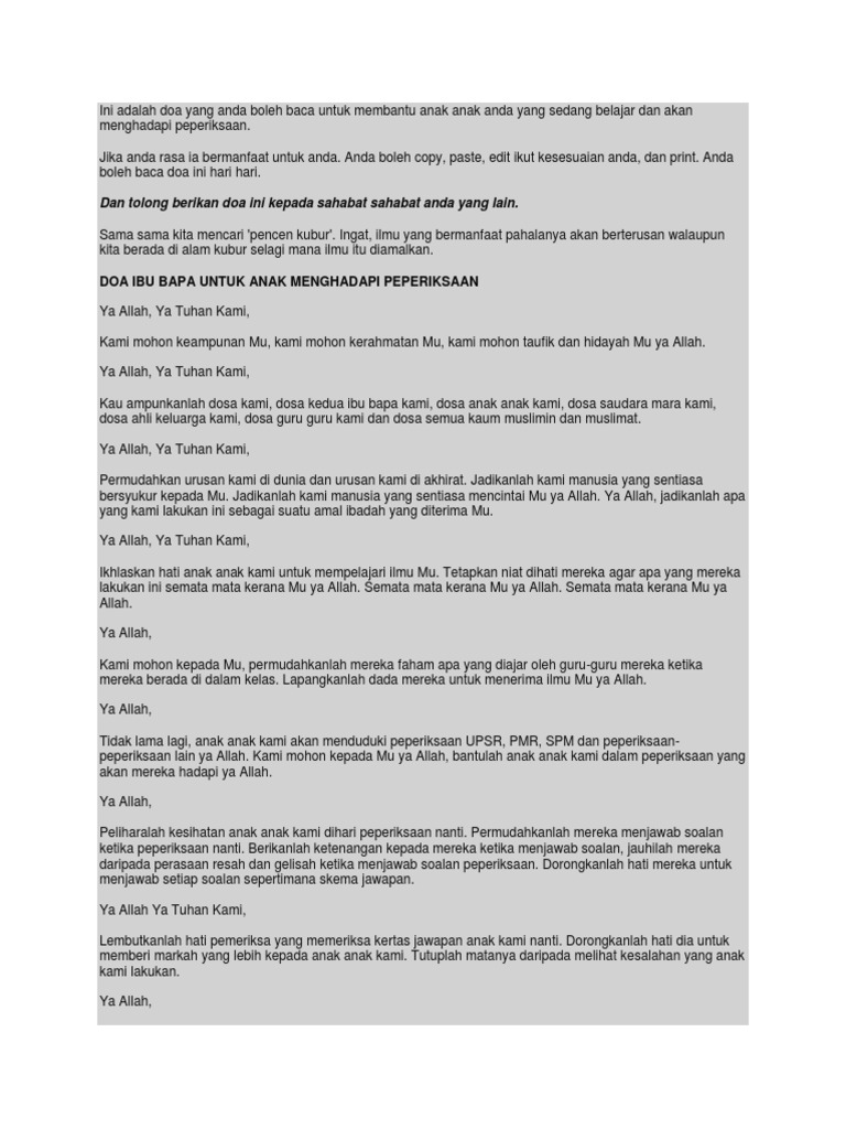 Doa dan zikir untuk lapangkan dada anak2 yang menjawab peperiksaan ustazah norhafizah musa 2018. Banyak peengorbanan dan perjuangan yang harus mereka hadapi. Doa ibu bapa untuk anak menghadapi peperiksaan ini adalah doa yang anda boleh baca untuk membantu anak anak anda yang sedang belajar dan akan menghadapi peperiksaan. Apa kah doa untuk anak yang menghadapi peperiksaan ? Karena doa anak sholeh dan sholehah lah yang mampu menolong orang tua di akhirat. Untuk ibu bapa yang anak menghadapi peperiksaan boleh amalkan doa ini. Semak artikel untuk tips dan doa anak menghadapi peperiksaan yang ibu bapa boleh amalkan. Doa untuk anak menghadapi peperiksaan doa allah. Selain mencegah dengan memberikan berbagai multivitamin dan suplemen tambahan untuk daya tahan tubuhnya, anda juga harus bersiap menghadapi kemungkinan si kecil. Doa yang ibu bapa boleh baca untuk membantu anak anda yang sedang belajar dan bakal menghadapi peperiksaan. Tips doa agar tidak gelisah untuk menghadapi. Anda boleh baca untuk membantu anak anak anda yang sedang belajar dan akan menghadapi peperiksaan. Sesungguhnya engkau maha mengetahui bahawa kami akan menduduki peperiksaan yang menentukan kejayaan dalam medan perjuangan kami.